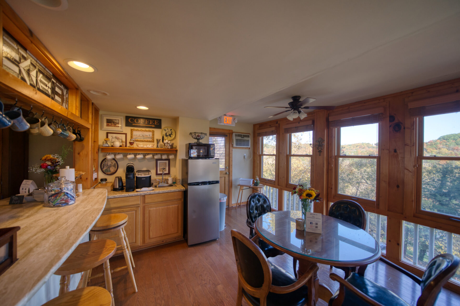 The lobby is surrounded with floor to ceiling windows offering stunning views of the Ozark Mountains. Board games are provided for some added fun!